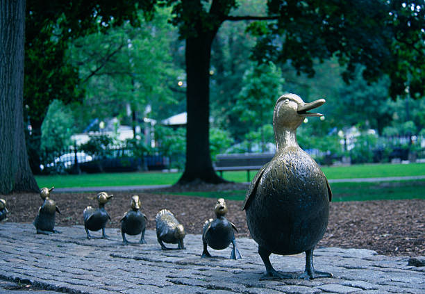 Adorable mother and ducklings in Boston Common to honor the favorite children’s book “Make Way for Ducklings” by Robert McClosky