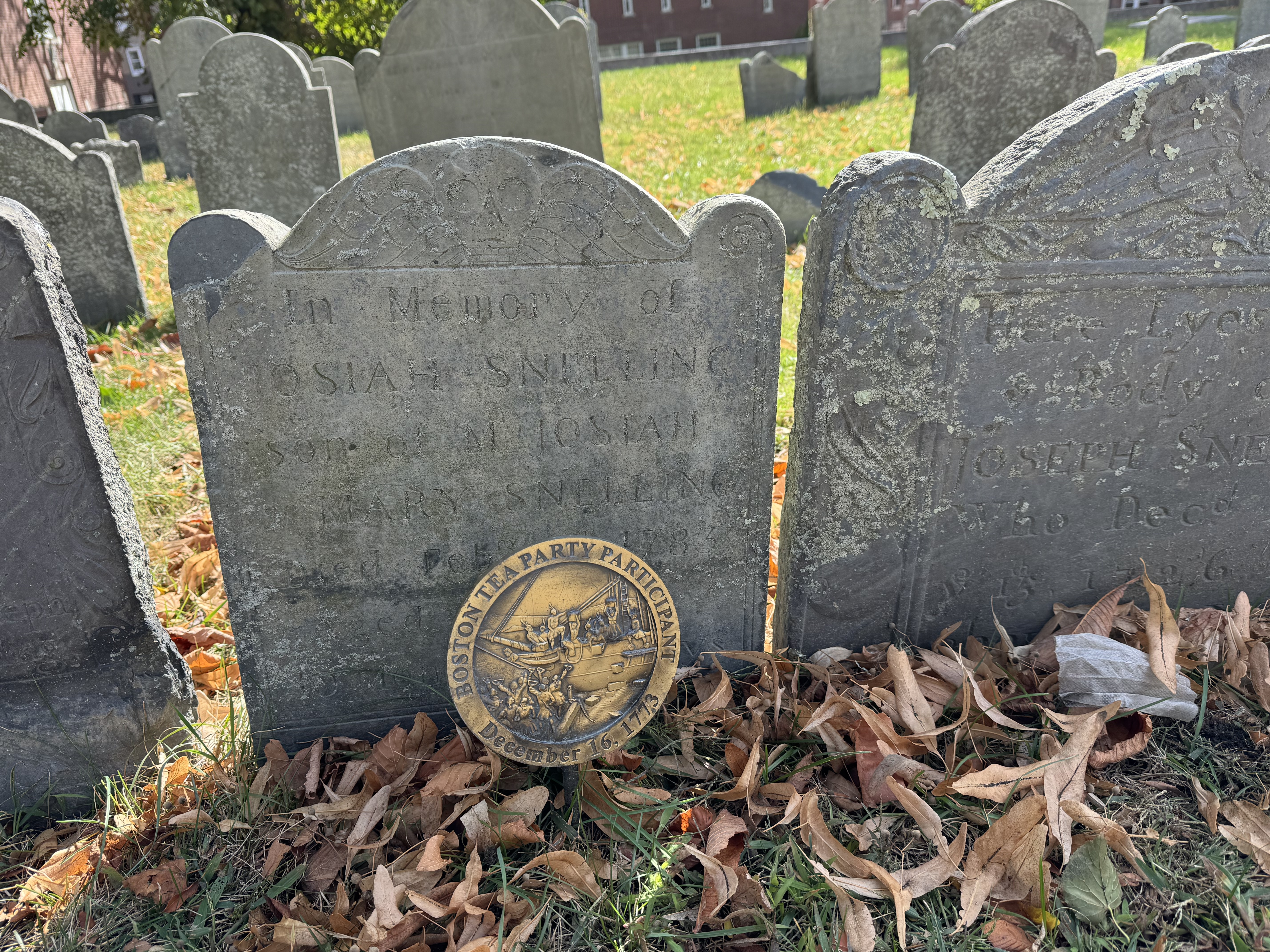 The cemetery also includes several of the men responsible for the infamous Boston Tea Party. They are known as the Sons of Liberty, and their graves are designated with a brass plaque. British soldiers used to shoot at these gravestones for target practice.