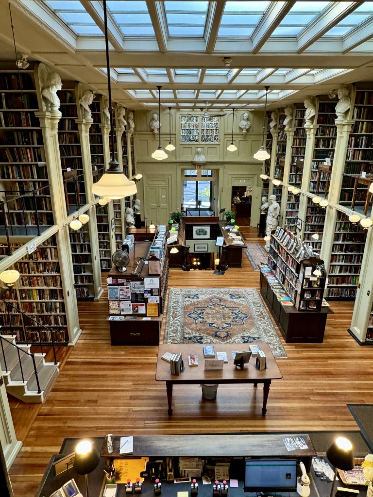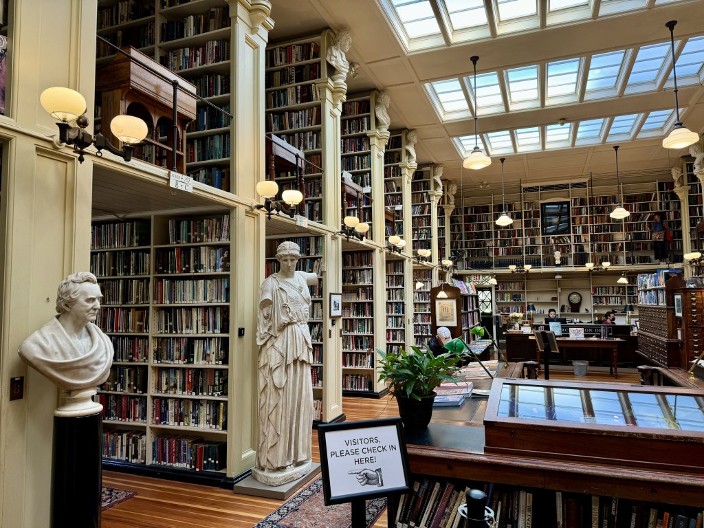 Our trip included a stop at the amazing Providence Athenaeum Library, first founded in 1836. Before we had modern day tax-supported public libraries, it was difficult to gain access to books. The only people lucky enough to enjoy reading a variety of books were those with personal collections, or the wealthy who paid fees to join exclusive “membership” libraries such as the Providence Athenaeum.